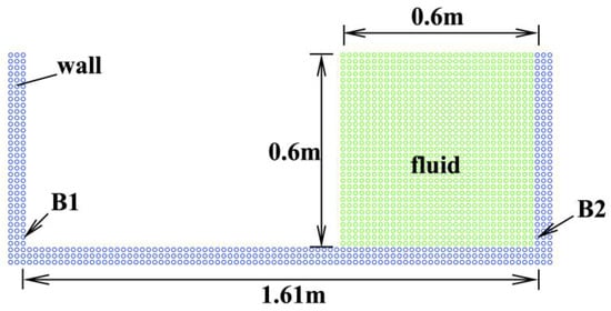 The dam-breaking experiment conducted by Lobovský et al. [42] was simulated using the models shown in Table 1. The experiment was conducted in a glass tank with 0.600 m height and 1.610 m length (shown in Figure 12). The initial width and height of the water column were both 0.600 m. Two monitoring points, B1 and B2, were set to observe the pressure variation. As is shown in Figure 12, B1 was located in the left corner of the tank. The other monitoring point, B2, was located in the right corner. These two points were both 3 mm from the bottom. B1 was in the area where strong slamming would occur, while B2 was in the area farthest from the strong slamming area. The simulations were performed at spatial resolution and time step length .