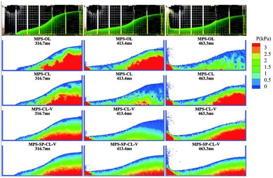 Figure 13 shows the particle distributions and the pressure contours of the dam-breaking fluid flows simulated by the four models. The nonsmooth free surface and unnatural pressure field were quite obvious in the pictures of the MPS-OL model, in which the original MPS scheme and the original Laplacian operator were used. The free surfaces in the pictures of the MPS-CL were smoother than those of the MPS-OL, but the pressure fields were still not smooth. The pictures of the MPS-CL-V showed a smoother free surface and pressure distribution; however, the pressure on the right-side wall was unstable over time. Compared to the results obtained by the other models, the pressure field and the free surface of the MPS-SP-CL-V were much better.