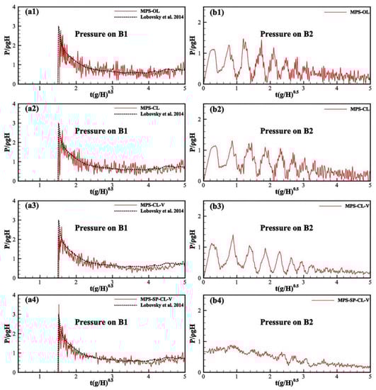 Time histories of pressure acting on B1 and B2 calculated by the models. (a1) Pressure on B1 calculated by MPS-OL; (a2) Pressure on B1 calculated by MPS-CL; (a3) Pressure on B1 calculated by MPS-CL-V; (a4) Pressure on B1 calculated by MPS-SP-CL-V; (b1) Pressure on B2 calculated by MPS-OL; (b2) Pressure on B2 calculated by MPS-CL; (b3) Pressure on B2 calculated by MPS-CL-V; (b4) Pressure on B2 calculated by MPS-SP-CL-V. The experiment curve of the pressure on point B1 is from Lobovský et al. [42].