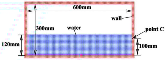 As described in this section, a violent sloshing process in a rectangular tank was simulated using the proposed method. As Figure 16 shows, the tank was 600 mm wide and 300 mm high. The initial water depth of the tank was 120 mm. A monitoring point C to detect pressure variation was located on the right wall 100 mm from the bottom. The tank was oscillated in the horizontal direction, and the motion followed the below equation: