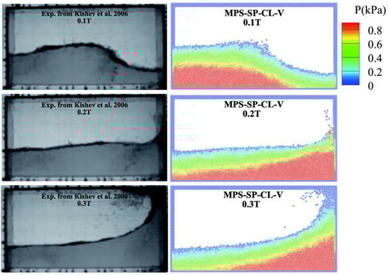 Figure 17 presents the free surface profiles of both the experimental results of Kishev et al. [44] and the MPS-SP-CL-V results at , , and , where is the oscillation period of the tank (1.3 s). The contour is the pressure distribution. As the figure shows, the pressure distribution distributed smoothly, and the free surface profiles of the MPS-SP-CL-V had good agreement with those of the experiment. Figure 18 shows the comparison of the pressure values from the original MPS method, the experiment of Kishev et al. [44], and the MPS-SP-CL-V method. From the figure, it is clear that the oscillation of pressure in the results of the original MPS method was huge and highly frequent. In contrast, the MPS-SP-CL-V method could successfully capture the typical pressure characteristics. It can also be seen from the figure that the pressure profile of the MPS-SP-CL-V was in good agreement with that of the experiment.
