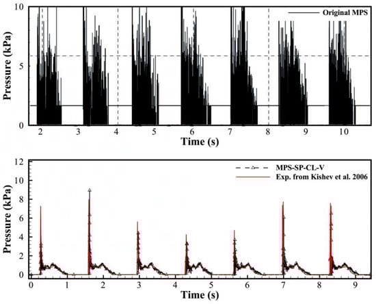 Comparison of the pressure in the experiment of Kishev et al. [44] and the original MPS method of Lee et al. [29].