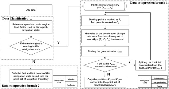 if the iterative approach is used. The compression algorithm considering the ship’s behavior is divided into two parts in parallel; the first part of the position data is compressed using the DP algorithm, so the time complexity is