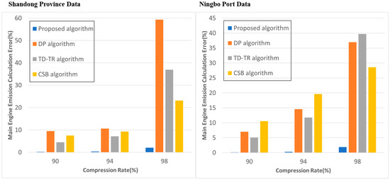 Figure 4. The DP algorithm emission calculation error is particularly high when the compression rate is 98%, reaching 59.321% and 36.983% in the two datasets, respectively. This is so that the data can be compressed using the DP algorithm, which ignores substantial speed fluctuations in favor of position information. As a result, for various compression rates, the DP algorithm performs the poorest in this regard. The approach suggested in this research performs an order of magnitude better than do the existing algorithms, and it shows the minimum error in emission computation at various compression rates. The emission calculation error of the suggested approach still fluctuates very slightly and is only 2.221% and 1.890% in the two datasets, even when the compression rate is raised to 98%. Other algorithms with the same compression rate have emission calculation errors of more than 20%. Due to the integrated considerations of position, speed, and direction information, the emission calculation error of the compression method, taking ship behavior into account, is 23.14% at the compression rate of 98%, which is much better than that of the DP and TD-TR algorithms. Between this algorithm and the algorithm suggested in this study, there is still a sizable gap. This is due to the algorithm’s additional disregard for the precise velocity fluctuation between the compressed trajectory points.