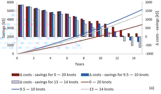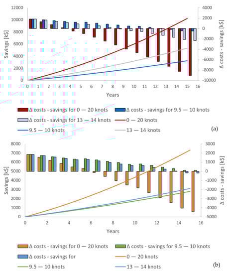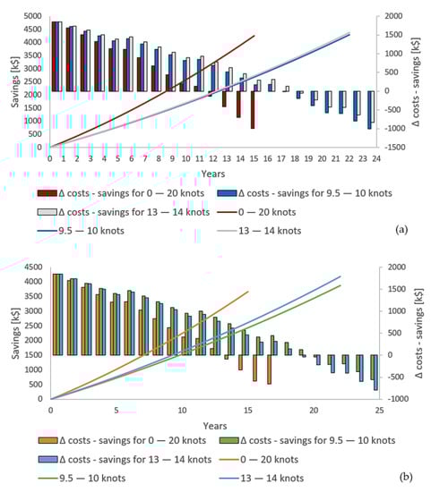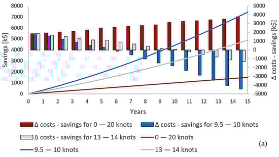 In these graphs, the bars represent the difference between costs and savings deriving from the constant usage of the rotors during navigations, while the lines highlight the savings with reference to the left y-axis. Each chart shows the same data for each year of work and for each one of the routes enlisted in Table 5, but with different rotor dimensions.