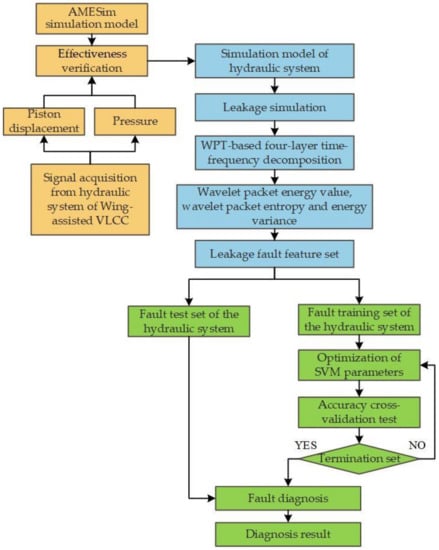 Fault diagnosis process of the wing hydraulic lifting and lowering hydraulic system based on WPT-SVM.