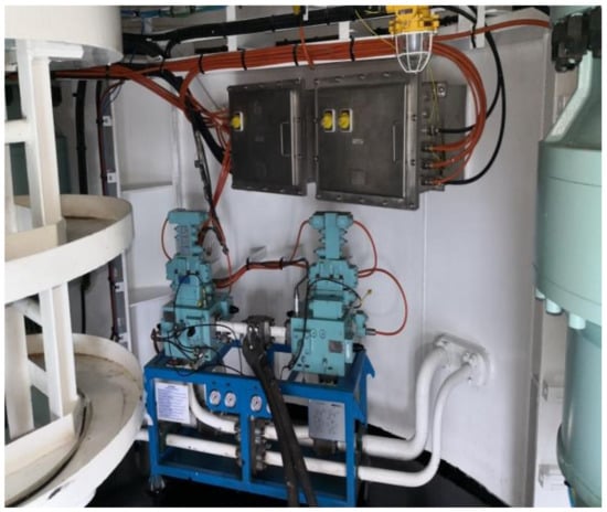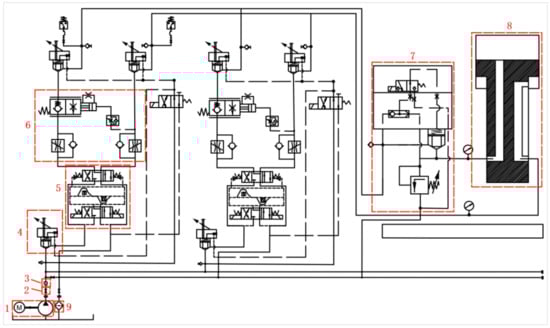 “NEW ADEN” uses a hydraulic system to drive the wings to lift and lower, and it shares the same hydraulic system with deck machinery such as the winch. There are four identical sets of wing lifting and lowering hydraulic systems assembled to realize the independent lifting/lowering control of each wing. The type of hydraulic oil in the hydraulic system is L-HV46 low pour point anti-wear hydraulic oil, which has a high viscosity index and is less affected by the ambient temperature. This study takes one set of hydraulic systems as research object; Figure 9 shows the layout of the system.