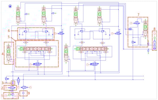 Simulation model of the wing lifting and lowering hydraulic system. 1. Hydraulic pump; 2. globe valve; 3. check valve; 4. cartridge valve; 5. electro-hydraulic re-versing valve; 6. balance valve group; 7. safety globe valve group; 8. hydraulic cylinder; 9. oil return filter.
