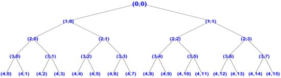 The hydraulic cylinder pressures are selected as signal processing objects, and a db6 wavelet is selected. The hydraulic cylinder pressure signal is decomposed into four layers based on WPT time-frequency decomposition technology. Sixteen wavelet packets are extracted from the four-layer decomposition results of pressure signals for analysis. The decomposition structure is shown in Figure 5.