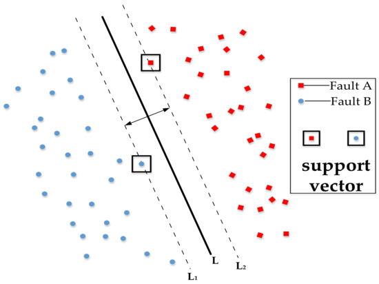 After the fault features are obtained, it is necessary to interpret and classify the information they represent. In the process of classification by SVM, the fault feature vector obtained by decomposing the hydraulic cylinder pressure signal is represented as Xi, which includes six types of wavelet packet features: energy quantization value, entropy, and energy variance of the pressure on piston side of the hydraulic cylinder as well as the piston rod side. Each input feature vector is matched by setting the corresponding leakage fault mode output label Yi. When the input feature vector only corresponds to two states, these two states can be set as fault A and fault B, and the data label is Yi = 1 or Yi = −1 at this time. As shown in Figure 6, the best interface that can maximize the distance between the two types of samples is found in the samples to be identified, and the support vector is used to outline the best classification surface.