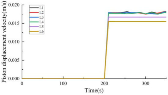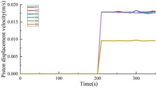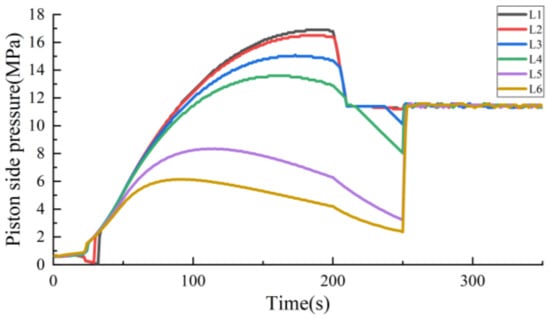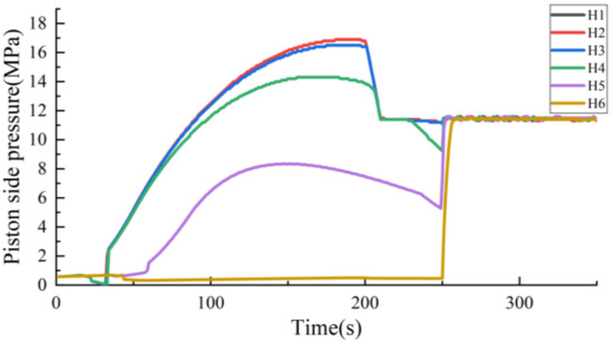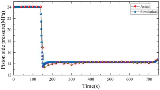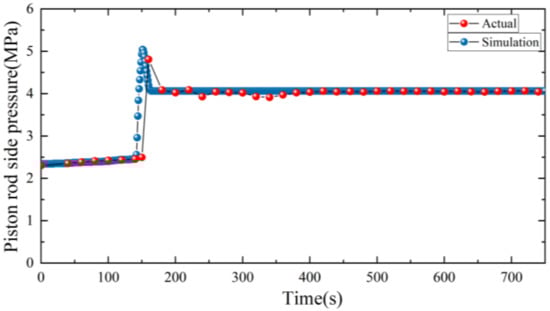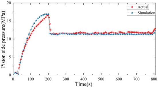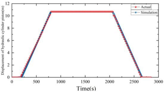 The pressure and piston displacement of the hydraulic system during the lifting stroke are obtained through the pressure sensor and altimeter. As shown in Figure 11, in the actual system, the piston needs 608 s to reach the highest position after receiving the lifting signal, and then keep its height stable. When receiving the lowering signal, it needs 602 s to reach the initial height. For the model, the time required for the piston to rise to the highest position is 600 s, whereas the time needed for the piston to fall from the highest position to the zero position is also 600 s. As the response speed of the components in the flow process of the simulation model is faster than that of the actual system, there is an error of 8s between the model and the actual system in the process of lifting, so that the simulation model can complete the lifting action faster.