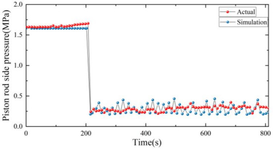 The pressure in the lifting process of the wing is extracted for analysis. Figure 12 and Figure 13 show the comparison between the model simulation and the actual system. For actual system, after receiving the lifting signal and carrying out the lifting, the initial pressure is not zero, but gradually increases with the charging pressure, and the maximum pressure is 16.6 MPa. When the lifting command is received at 200 s, the cartridge valve and oil return circuit are opened, and the discharge of oil from the piston rod chamber causes the pressure to plummet to the range of 11.3–11.5 MPa and causes the piston to move up. The pressure on the piston side decreases as the volume of the piston chamber increase, and its initial pressure is about 1.7 MPa. Then, the pressure gradually stabilizes in the range of 0.2–0.4 MPa under the action of oil supply from the hydraulic pump. For the simulation model, the same charging process is set for 200 s, and after that, the lifting signal is input into the system. During the charging process, the maximum pressure on the piston side is 16.9 MPa, and then drops to 11.2–11.5 MPa to gradually stabilize; the pressure then decreases to 0.2–0.5 MPa from 1.6 MPa.