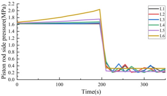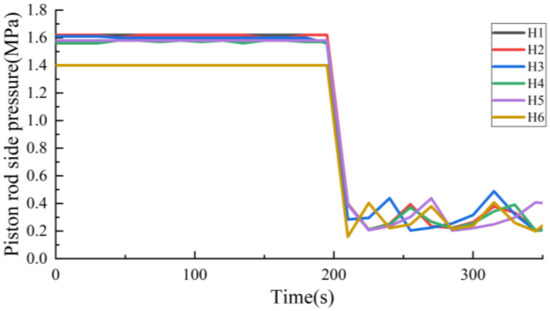 Figure 14 and Figure 15 show the pressure comparison when lowering. For actual hydraulic system, when the lowering operation is carried out, the oil inlet and return circuits are opened, and the piston rod side pressure increases rapidly. As the piston moves down, the volume of the piston rod chamber expands, and the piston rod side pressure finally stabilizes at 3.9–4.1 MPa, in contrast, the piston side pressure decreases from 24.1 MPa under the action of oil unloading, and then the pressure finally stabilizes at 13.8–14.3 MPa due to the volume reduction. For the simulation model, it reaches stable state faster with the same setting of the actual hydraulic system.