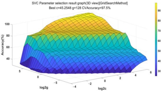The leakage fault diagnosis of the wing lifting and lowering hydraulic system is a multi-class problem, the C-SVC classifier is established to identify the leakage fault of the system. As the fault classification of the wing lifting and lowering hydraulic system is a nonlinear problem, it is necessary to use the kernel function to solve its classification problem. As a kernel function with strong local processing, the Gaussian radial kernel function (RBF) can map samples from low dimension to high dimensions [38,39]. The RBF-kernel-function-classified hyperplane is in Equation (20):