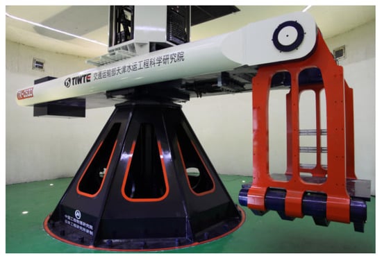 The geotechnical centrifuge used in the test is shown in Figure 1 (Model is TK-C500). It has an effective capacity of 500 g·t, with a maximum centrifugal acceleration of 250 g and a maximum rotation radius of 5 m. The shaking table can simultaneously output the horizontal and vertical excitations with a peak exciting acceleration of 40 g horizontally and 20 g vertically, and the exciting frequency scope is 20 to 200 Hz. The model box used in the test is a stacked laminar shear box with an internal dimension of 350 mm × 800 mm × 400 mm, which can weaken the reflection of seismic waves on the lateral boundaries. The centrifugal acceleration in the test is set as 50 g. Accordingly, the similarity ratio of the physical model is 1:50.