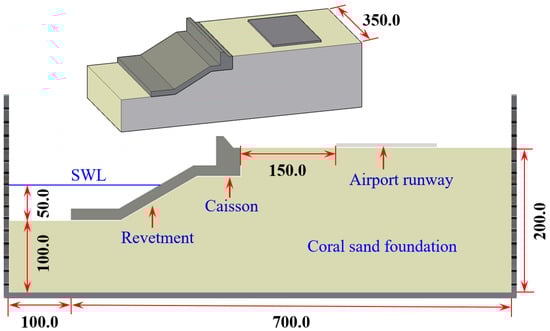 For the revetment breakwater and other types of structures built on the islands of coral reefs, the environmental loads mainly include ocean waves and earthquakes. On the wave-induced dynamics and stability of revetment breakwaters in the SCS, some physical model tests (Ye et al. [], He et al. [,], Zhang et al. []) and numerical analyses (Guo []) have been conducted in recent years. However, there is still very little research on the seismic dynamics and stability of the revetment breakwaters and other structures built on the coral reef in the SCS. United States Geological Survey (USGS) [], Zhou and Adams [] pointed out that the potential of strong earthquakes was great in the SCS. Furthermore, the results of Sun et al. [] showed that a strong earthquake and great tsunami event occurred in the sea area around Xisha Island in the SCS around 1024 AD. Previous studies (Memos and Protonotarios [], Iai and Kameoka [], Hamada et al. [], Sumer et al. []) have shown that once an earthquake occurs near engineering sites, marine structures may be damaged due to the foundation instability. Seismic loading brings a great threat to the safety and stability of the revetment breakwaters and their nearby runways built on these reclaimed coral sand foundations in the SCS. Therefore, it is of great engineering importance to study the seismic dynamics of the revetment breakwater and its runway in the SCS.