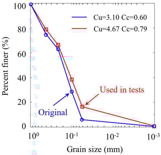 Grain size gradation of the original coral sand and the re-proportioned sand.