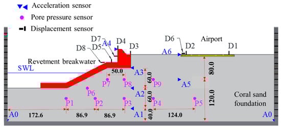 The arrangement of sensors in the physical model is shown in Figure 4. Eight three-directional acceleration sensors are buried in the coral sand foundation, of which A0 is placed at the bottom of the model box for recording and calibrating the incident seismic waves. Nine pore pressure sensors are installed in the coral sand foundation, layer by layer. Eight displacement sensors (including LVDT and laser displacement meter) are installed to record the horizontal and vertical displacement responding of the breakwater and runway, respectively. In the test, to ensure the density and uniformity of the foundation, the coral sand foundation is prepared by the layered compaction method, and each layer is compacted to only 120% of the predetermined height. Through several tests, it is found that the designed layer thickness can be achieved by leaving 20% extra thickness for each layer of the coral sand after settling in the 50 g centrifugal gravity field. Sensors are installed at designed locations as that in Figure 4. After model preparation, the HPMC solution is poured into the stacked laminar box, and then the physical model is saturated in the 50 g centrifugal gravity field for half an hour. The completed physical model is shown in Figure 5.