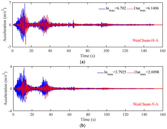 Comparison of the input and output seismic waveforms of centrifuge shaking table. (a) Horizontal. (b) Vertical.