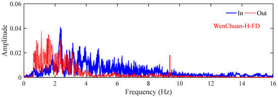 According to the convention of the centrifuge shaking table test, before the formal test begins, a temporary model with the same mass as the physical model is prepared and installed on the centrifuge shaking table, to commission and ensure that the output waveform of the shaking table can be as close to the target waveform as possible. The comparison of the input and output seismic waveforms of the centrifuge shaking table is shown in Figure 6, and the comparison of the frequency distribution is shown in Figure 7. It can be seen that the waveforms of the input and output seismic waves are basically consistent, while the peak acceleration of the output seismic waves is relatively small. The frequencies of the input and output seismic waves are both mainly distributed in the range of 0–10 Hz. After several times of commissioning, it is found that the output seismic wave of the shaking table can meet the test requirements. Finally, the waveform recorded by the acceleration sensor A0 installed at the bottom of the model box is used as the excitation seismic wave for the subsequent analysis of the test results.