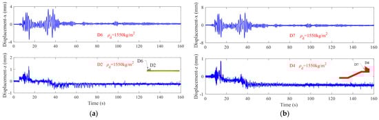 Figure 8 shows the time histories of the displacement of the runway, caisson, and revetment. This study stipulates that the horizontal displacement is positive if it is toward the seaside (right side), and the vertical displacement is positive if it is upward. It is shown that the horizontal displacement of the runway (recorded by D6) has a significant oscillation of about 3.5 mm, but there is no residual displacement. The vertical residual settlement (recorded by D2) of the runway is approximately −0.4 mm. Similarly, neither the caisson nor the revetment has residual displacement in horizontal, but they both have a greater amplitude (about 6 mm) of displacement oscillation. The vertical residual settlements of the caisson (recorded by D4), and the revetment (recorded by D5) are about −0.5 mm and −0.6 mm, respectively. As shown in Figure 8, when the incident seismic acceleration reaches its peak value (about at 16 s, 32 s, and 38 s, respectively), the oscillation amplitude of the runway and breakwater is correspondingly significant, and the development rate of the residual displacement is also fast. Overall, under the excitation of this strong seismic wave, the final residual displacement of the revetment breakwater and runway is small in magnitude. Both the revetment breakwater and runway built on the coral sand foundation are completely in a repairable state. It is indicated that the seismic performance of the breakwater and runway is good.