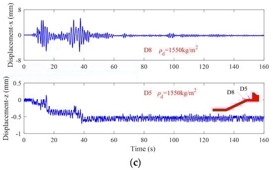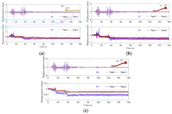 The comparisons of the displacement responding at typical positions in Test 1 and Test 2 are illustrated in Figure 16. It can be seen that the general trends of the displacement responses of the aircraft runway and breakwater in Test 1 and Test 3 are basically consistent. However, the amplitude of displacement oscillations for the runway and breakwater in Test 3 is smaller than that in Test 1. It can also be seen in Figure 16b,c that the residual settlement of the breakwater in Test 3 is approximately 50% of that in Test 1. This shows that seismic intensity directly affects the stability of the breakwater and runway. When performing seismic design, the selection of an appropriate fortified seismic intensity level is crucial to guarantee the stability of the structures.