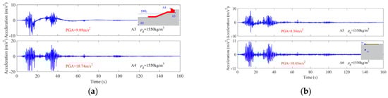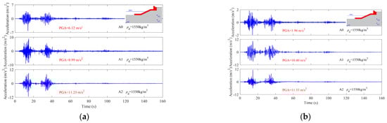 Figure 10 shows the horizontal acceleration dynamic responding of the revetment breakwater and runway. It is seen that the peak acceleration responding at A4 on top of the caisson reaches 18.74 m/s2, and the peak acceleration responding at A6 on the runway is 10.43 m/s2, showing a significant amplification effect compared with the peak acceleration of the input seismic wave of 6.12 m/s2.