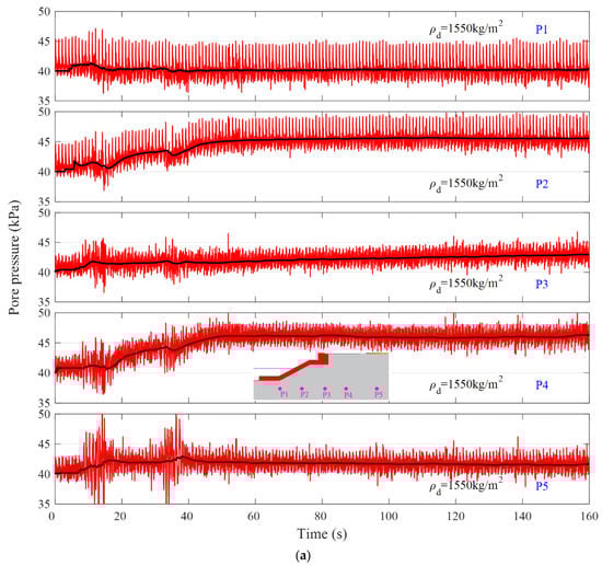 Figure 11 shows the dynamic response of pore pressure at typical positions P1 to P8 within the coral sand foundation. Under the action of the strong earthquake, the pore pressure accumulates in the coral sand foundation, and the maximum residual pore pressure reaches 7 kPa. As shown in Figure 11a, the oscillation amplitude of pore pressure at P1 is great, but there is no accumulation of pore pressure. The reason for this is that the overlying coral sand of P1 is relatively thin, and the drainage path is short. As a result, the pore pressure at P1 dissipates very quickly and is difficult to accumulate. It is demonstrated by Figure 11b that there are two negative values of the pore pressure at P6 at 15 s and 35 s, which means the pore pressure here is less than its initial hydrostatic value. The possible reason for this is that the coral sand beneath the revetment breakwater is in a state of shear dilatation when the seismic acceleration is strong, and the volumetric dilatation leads to a significant drop in pore pressure. P8 is also located in the region where shear deformation occurs beneath the breakwater, and a similar phenomenon also occurs.