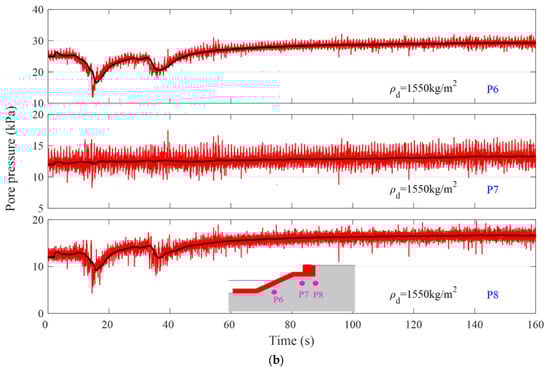 Figure 17 shows the comparison of the pore pressure responding at typical positions in the coral sand foundation in Test 1 and Test 3. It can be seen that the pore pressure responding patterns in Test 1 and Test 3 are also basically consistent, and the accumulated magnitudes of excess pore pressure are basically the same. The above results show that the seismic intensity does not strongly affect the pore pressure inside the coral sand foundation, while it has a more significant effect on the displacement of the revetment breakwater and runway.