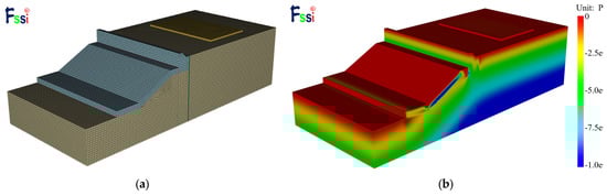 To further evaluate whether the liquefaction occurs or not within the coral sand foundation, the initial effective stress field of the physical model needs to be estimated. In this study, the numerical simulation software FssiCAS is utilized to estimate the initial effective stress within the physical model under the 50 g gravity environment. FssiCAS is a powerful FEM software in the fields of marine geotechnics and marine engineering geology, available at https://www.fssi.ac.cn/download.html (accessed on 25 October 2022). The established finite element model and mesh discretization (hexahedron element) are illustrated in Figure 12a, where the total number of finite element elements is about 200,000. The boundary conditions applied are as follows: (1) The bottom of the model is fixed for displacements in x, y, and z directions, and the four lateral faces are fixed in horizontal. (2) The hydrostatic pressure of 50 (h is the distance from a point on the surface of the coral sand foundation to the static water level (SWL)) is applied to the surface of the coral sand foundation and revetment and ensuring that the effective stress on the surface of the coral sand foundation is zero. Since the simulation here is only to estimate the initial effective stress, the elastic constitutive model is adopted for the coral sand foundation, breakwater and runway. The vertical effective stress distribution is shown in Figure 12b.