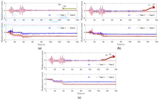 Comparisons of displacement responding at typical positions in Test 1 and Test 2. (a) Runway. (b) Caisson. (c) Revetment.