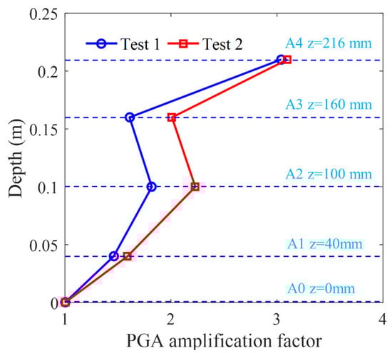 The relationship between the amplification factor to the horizontal peak acceleration and the elevation at typical positions in Test 1 and Test 2 is shown in Figure 14. It can be seen that the amplification factor of horizontal acceleration is positively correlated with the elevation it locates, regardless of whether the coral sand foundation is in a dense or less dense state. However, the amplification factors in Test 2 are slightly greater than that in Test 1. In Test 2, the peak seismic acceleration recorded at A4 on the caisson is approximately 19 m/s2 with an amplification factor of 3.11. The test results show that the density of the coral sand foundation has an important impact on the seismic amplification effect, and the amplification effect on seismic waves is more significant in a less dense coral sand foundation.