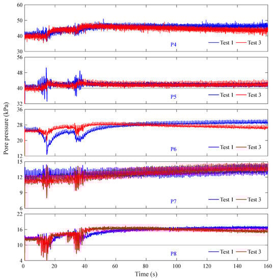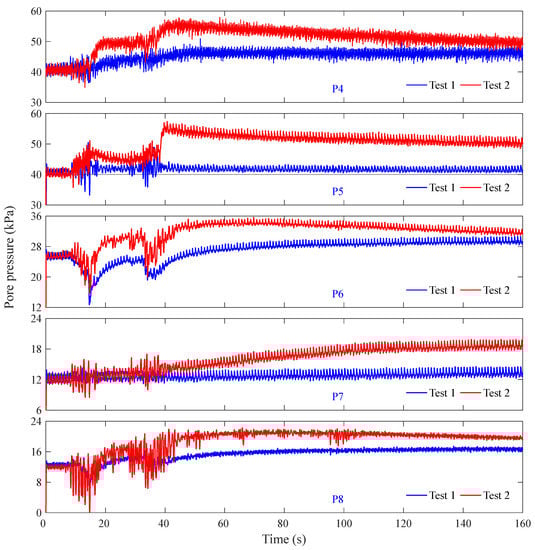 The time histories of pore pressure at typical positions in Test 1 and Test 2 are shown in Figure 15. It can be seen that the accumulation rate of pore pressure is faster and the accumulated amplitude is greater in Test 2. The excess pore pressure at P4 in Test 2 can approximately reach 15.5 kPa, which is 2.2 times greater than that in Test 1. It is indicated that the accumulation of excess pore pressure, reduction of effective stress, and softening or even liquefaction is more likely to occur in less dense coral sand foundation. In addition, it can also be seen in Figure 15 that the pore pressure responding characteristics in Test 1 and Test 2 are basically the same, especially at P6, where both Test 1 and Test 2 capture the negative value of the accumulated excess pore pressure. The generality of the phenomenon, the good reproducibility of the test, and the good reliability of the test results are indicated.