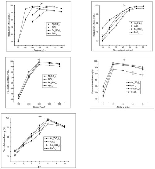 Stirring speed affects the binding degree of microalgae and flocculants. The flocculation efficiencies of C. vulgaris under various stirring speeds are shown in Figure 2c. When the stirring speed was low, the flocculation efficiency of C. vulgaris was low because a low stirring speed may lead to poor dispersion of flocculant in liquid and less contact between the positively charged flocculant and negatively charged C. vulgaris [29,30,31]. With the increase in stirring speed, the dispersion of flocculant, collision frequency, and contact intensity between C. vulgaris and flocculant increased, and the positively charged flocculant quickly neutralized the negatively charged C. vulgaris cells [31], resulting in a steady increase in flocculation efficiency. At a stirring speed of 300 rpm, the optimal microalgae flocculation efficiencies for Al2(SO4)3, AlCl3, Fe2(SO4)3, and FeCl3 were 98.67 ± 0.59%, 98.67 ± 0.60%, 97.33 ± 0.91%, and 93.47 ± 0.71%, respectively. A further increase in stirring speed will lead to a reduction in flocculation efficiency because a high stirring speed will lead to excessive shearing, destroy the flocculant and microalgae flocs, and disperse the coagulated cells into the medium again [29,30].