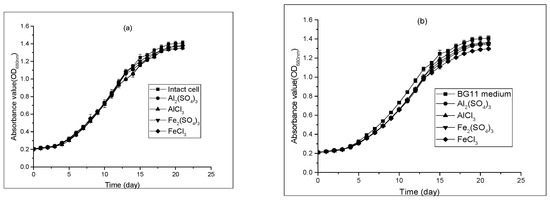 The main objective of microalgae harvesting Is to obtain concentrated algal biomass for downstream processing. The flocculants combined with microalgae may pollute the algal biomass and affect the subsequent treatment. However, the effects of flocculants on downstream processes are not clear, especially the state of cells in flocs, the regeneration ability of cells in flocs, and the extraction of compounds from biomass. In addition, water reuse is another potential way to reduce the costs of microalgae production. Recovering the waste medium after microalgae harvesting can reduce water demand by 80%, nutrient inputs by 44%, and subsequent wastewater treatment [14,15]. A few studies have been conducted on the regeneration of microalgae from flocculated and sterilized or filtered waste media such as Scenedesmus sp., C. vulgaris, C. fusca, Muriellopsis sp., Scenedesmus subspicatus, and Nannochlropsis oculate [16,17,18]. However, there are few studies on the recoverability of waste media (unpurified) from microalgae harvested by flocculants for subsequent cultivation of microalgal cells. In this study, the flocculation performance of C. vulgaris was evaluated using two types of chloride flocculants (AlCl3 and FeCl3) and two types of sulfate salts (Al2(SO4)3 and Fe2(SO4)3). Furthermore, the reusability of spent medium for culturing microalgae was assessed, and the impacts of flocculants on the quality of the harvested microalgae were also examined.