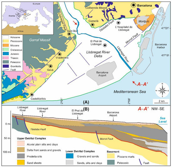 - Alcalá-García, F.J.; Miró, J.; Rodríguez, P.; Rojas-Martín, I.; Martín-Martín, M. Actualización geológica del delta del Llobregat (Barcelona, España). Implicaciones geológicas e hidrogeológicas. In Tecnología de la Intrusión de Agua de Mar en Acuíferos Costeros: Países Mediterráneos; López-Geta, J.A., de la Orden, J.A., Gómez, J.D., Ramos, G., Mejías, M., Rodríguez, L., Eds.; Geological Survey of Spain: Madrid, Spain, 2003; Volume 1, pp. 45–52. [Google Scholar]