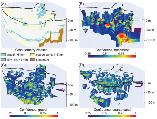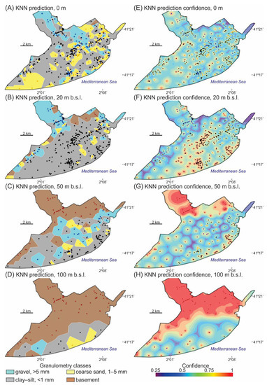 4.1. The Mapping of the Grain-Size Horizontal Sections: KNN Predictions and Confidences