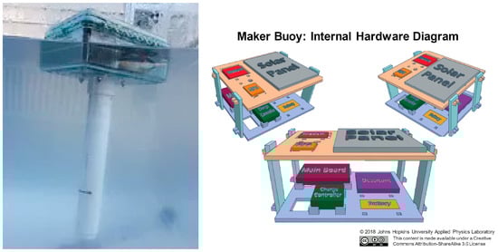 (Left) panel: picture of a Maker Buoy drifter sitting inside water. (Right) panel: a 3D visualization of the electronics layout inside the topside compartment.