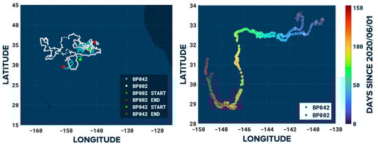 After being used to evaluate the performance of cleanup systems S001 and S001/B between October 2018 and May 2019 as further detailed in [], the two drifters were permanently deployed in the GPGP. BP002 was deployed from an MSS-Transporter vessel on 26 June 2019 at coordinates 142.66°W and 33.65°N. BP042 was deployed from an MSS-Transporter vessel on 15 May 2019 at coordinates 145.38°W and 31.38°N. BP002 and BP042 survived 1115 days and 622 days, respectively. The resulting tracks of the drifters are depicted in Figure 2, where the extent of the full trajectories is depicted in the left panel and a close-up view of the convergent event is given in the right panel.