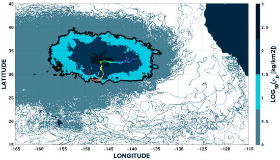 Background color: 30 day averaged modelled plastic surface density (MPSD) map in August 2020 ( expressed in kg/km2) in logarithmic scale; thick black line (between grey–blue and light blue colors): iso-contour of = 5 kg/km2; rainbow-colored dots: tracks of the drifters during the convergent event period between 1 June 2020 and 1 November 2020.