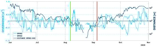 Light blue: velocity divergence for the two drifters BP002 (solid line) and BP042 (dotted line), 24 h averages; navy blue: distance between the two drifters, 24 h averages (logarithmic scale used to account for the theoretical exponential evolution of distance in a uniform divergence); grey–blue solid line: 0 divergence. The start and end of the convergent episode are evidenced by the green and red lines, respectively (7 August to 3 September).