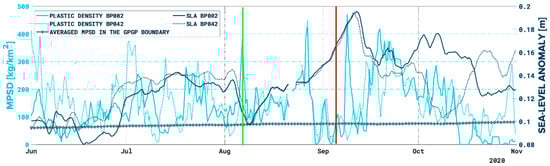Light blue: encountered MPSD for the two drifters BP002 (solid line) and BP042 (dotted line), 24 h averages; navy blue: evolution of the sea-level anomaly (SLA) for the two drifters BP002 (solid line) and BP042 (dotted line); solid grey–blue line: averaged plastic density in the GPGP (materialized by the area inside the thick black line contour of Figure 3). The start and end of the convergent episode are evidenced by the green and red lines, respectively (7 August to 3 September).