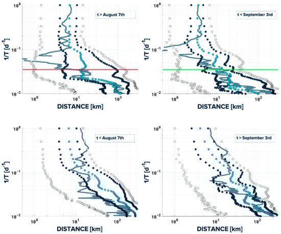 as a function of the measured distance between BP002 and BP042 and the pairwise distances of Lagrangian particles located within a 10 km radius of the middle point between the two drifters. The median (light blue dots), 5% and 95% (light grey dots), 25% and 75% (navy blue dots) quantiles of the pairwise distances were compared with the measured 1 day averaged distance between BP002 and BP042 (grey–blue line). Four configurations were studied at the end and start of the convergent event (top left and right): after 7 August and before 3 September (bottom left and right), before 7 August and after 3 September. The start and end of the convergent episode are evidenced by the green and red lines, respectively.