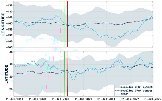 The 3-year trajectory of BP002 was compared with the trajectory and extent of the GPGP over that period (Figure 7). The GPGP extent corresponded with the limits in longitude and latitude of the 30-day rolling averaged MPSD iso-contour at 1 kg/km2 in a similar fashion as the one depicted in Figure 3 (for 5 kg/km2). The GPGP center coordinates were obtained by weight-averaging the coordinates contained within this iso-contour by the MPSD. In this figure, one can first observe that for both coordinates, they tended to stay within the GPGP boundaries during the 3 years, except for 1 month of the first year (November–December 2019) in latitude, which could be justified by the fact that the initial release location was far from the GPGP center latitude at that time. It also shows that BP002 tended to follow the same oscillations as the GPGP boundaries, but with a much larger amplitude than the GPGP center; this was reasonable, given the way the GPGP center was being tracked. It was also visible that the convergent event occurred when BP002 was very close to the GPGP center. Finally, it appeared that BP002 came very close to where it was released after 3 years of drifting in the GPGP.