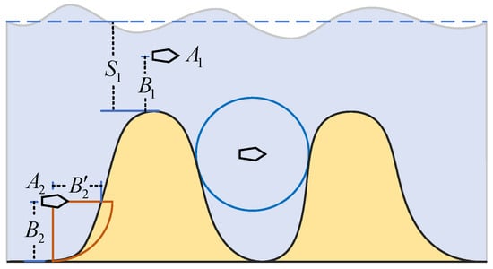 A horizontal safety map aims to add a horizontal safety criterion (horizontal safety threshold ) based on the vertical safety map. This method is suitable for scenes that are sensitive to horizontal distance, and it has different requirements for horizontal and vertical safety distance. All grid points must find the highest point of elevation data within the range of their horizontal distance of , which is defined as , and then calculate where is the vertical safe distance, which is the vertical safe range of such problems. In addition, AUV must increase a pie-shaped space with a thickness of along the ridge (Figure 4b). Thus, the safe distance directly below the AUV is longer than , and the safe distance from the horizontal area is longer than .