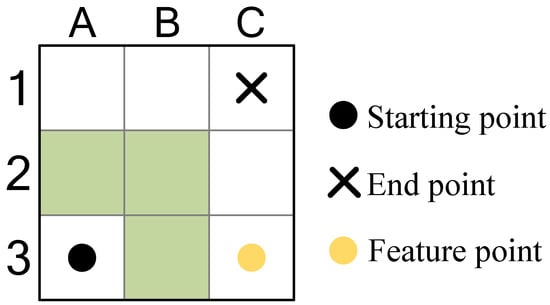 As shown in Figure 3, from the beginning to the end, the expansion order of ordinary A* algorithm should be , and its generation value . All the expansion states in this process are locally consistent. If the feature points must be passed during path planning, then the expansion order is . At this time, , , the states of and are locally inconsistent because the shortest path to is or , . This inconsistency will continue to pass backward with the expansion, resulting in , and the length of the final path cannot be controlled. Therefore, if the number of feature points in the path is considered while planning the path, then the expanded state is locally inconsistent. Moreover, we cannot ensure the bounded sub-optimality of the path.