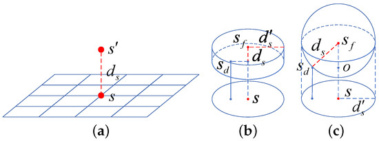 When the straight-line distance is used as the safe distance, the spherical safety map construction method must be used. This method is widely applicable, which is primarily considered in this paper, and the default method is considered for subsequent experiments. All grid points must be traversed in the range of horizontal distance . In addition, the highest point and the intersection point of vertical lines on the ground from to s point must be defined as and o, respectively, and then calculated to obtain (Figure 4c).