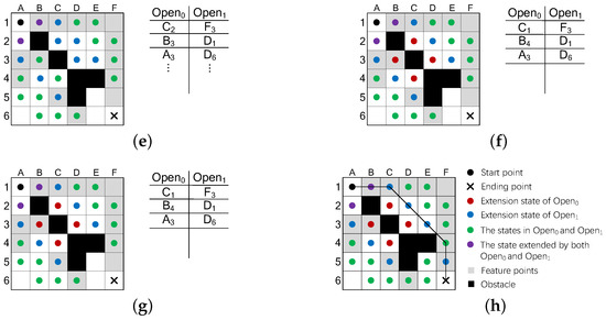2D illustration of the RA* algorithm. (a) Since there are only starting states in and , the condition of simultaneous extension is met. After extension, . (b) Same as the first step. (c) The ordinary A* algorithm will extend , while our algorithm will give priority to the maximum state of to extend, so as to ensure as many traversal of ridge points as possible, so it will extend at this time. (d) The effect after expansion is reflected in Figure 5d. (e) After several extensions, all the states in exceed the limit condition, then the limit needs to be further increased so that the states in can continue to expand, then is expanded separately. (f) Extend separately. When is extended, the top element of is replaced by other new states. Since f of is the smallest of , f of other elements must be larger than f of , so also increases. Repeat this step until the state in meets the boundary condition. (g) It is not until this state that some states in meet the boundary conditions again. (h) This is the final state, and the black line is the final trajectory.