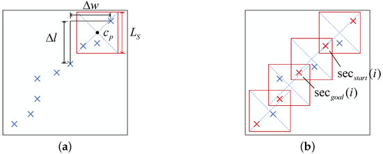Then, the map and ith group data are clipped and saved into , with as the center and as the side length, as shown in the red box in the figure. The four vertices of the square region are . Finally, the current vertex is saved as the starting point of the next and iterated until all the points in are traversed. In addition, the starting point and ending point in are recorded as the starting point and ending point of (Figure 7b).