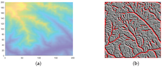 Figure 8a shows the topographic thermal map generated by MATLAB, with yellow representing shallow areas and blue representing deep areas. Figure 8b is the map generated by ArcGIS toolbox, which is formed by overlapping two layers, in which red represents ridge points (), which are obtained by binary classification. Moreover, the remaining gray protrusions represent ordinary depressed areas, which are determined as non-ridge areas (), because they are not enough to meet the criteria for judging ridges. The scale of the following experimental map is 1:30, that is, each pixel or grid represents 30 m.